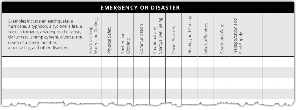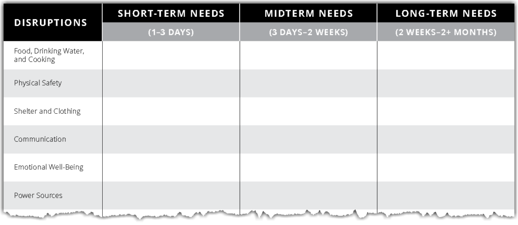 Use this worksheet to plan for immediate and long-term needs. Identify the resources you will need in each time frame. For example, imagine the disruption is to your shelter. A short-term need could be using a meetinghouse, a midterm need could be staying with friends or family members, and a long-term need could be repairing your home or buying a new one. Use the Take Action section to plan for any needs you might have.