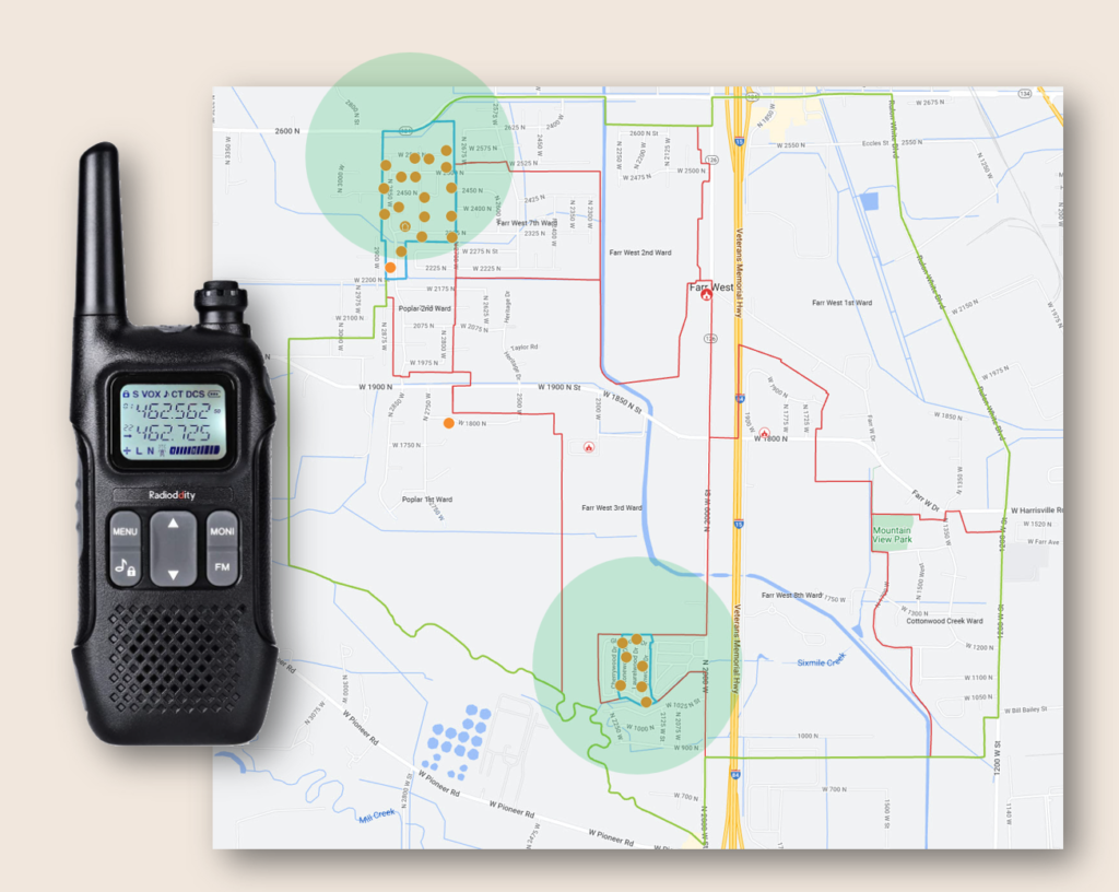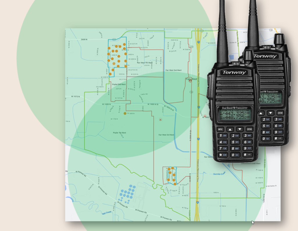 FRS Radios will not reach outside of the ward boundaries, nor are they able to communicate between our ward and members of the Westwood village due to the short FRS radio transmission range.